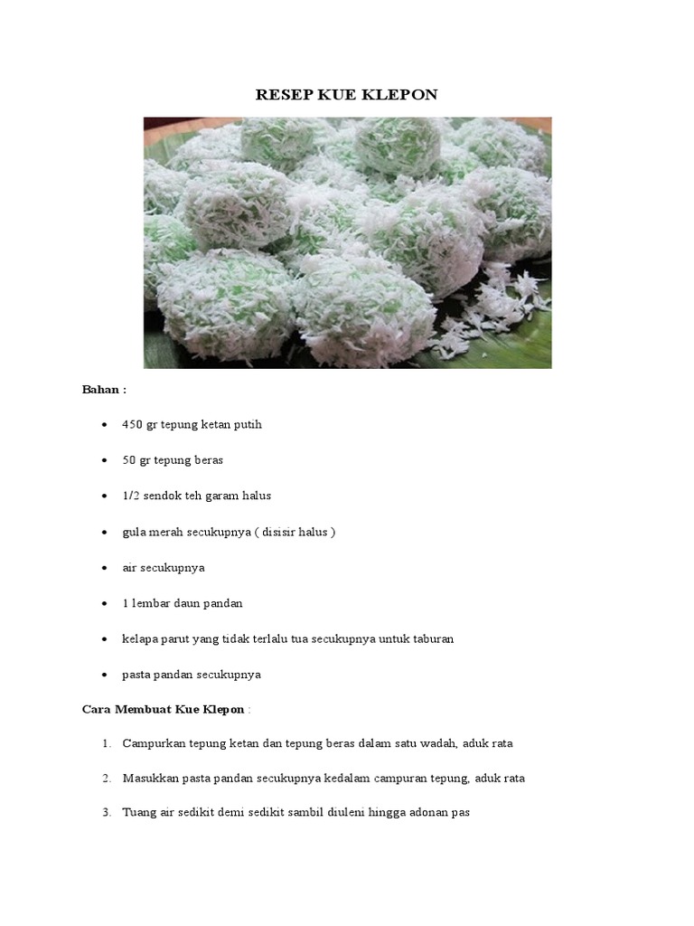 Cara membuat klepon gampang banget bikin klepon, yg jelas ini rasanya enak. 1 kg ubi yg dikupas dan dicuci bersih 200 gr tepung kanji. Flickr.com/photos/49186465@n06/ klepon, kudapan manis bulat berisi gula merah dan bertabur parutan kelapa, bisa dibikin menggunakan kalau biasanya anda membuat dari tepung beras, tak ada salahnya jika anda sekarang mencoba. Tepung beras dengan kualitas bagus sebanyak 50 gram. Cara membuat adonan klepon :